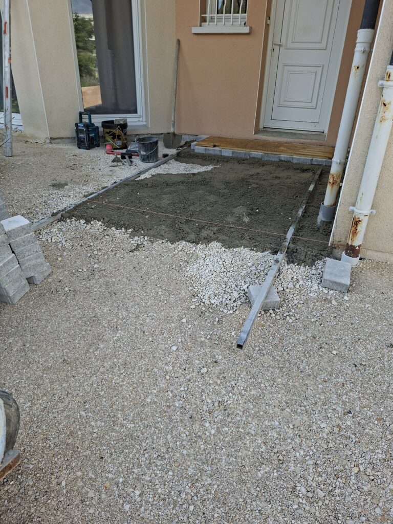 Réalisation d’une terrasse de 120m carré sur fondations, à l’aide d’un camion pompe de quarante mètres.