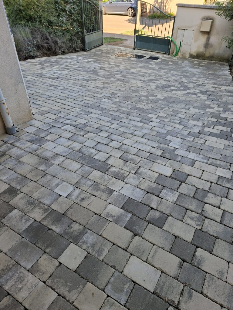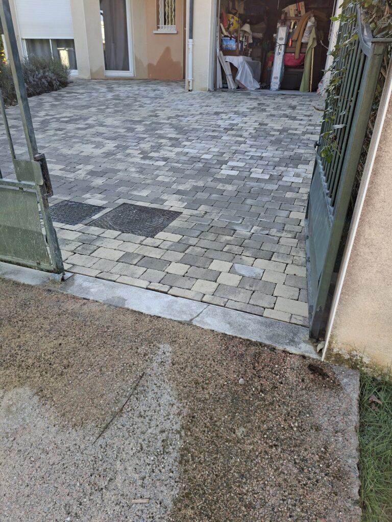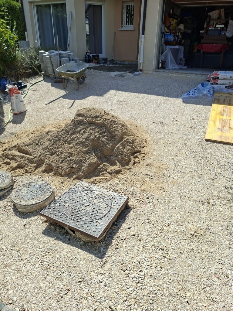 Réalisation d’une cour en pavé, finition en sable 0/2.